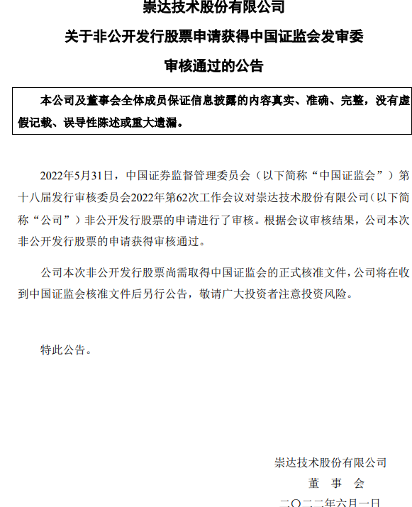 崇达技术(002815.SZ)今日发布公告,公司申请非公开发行股票获得中国证监会第十八届发行审核委员会2022年第62次工作会议审核通过。