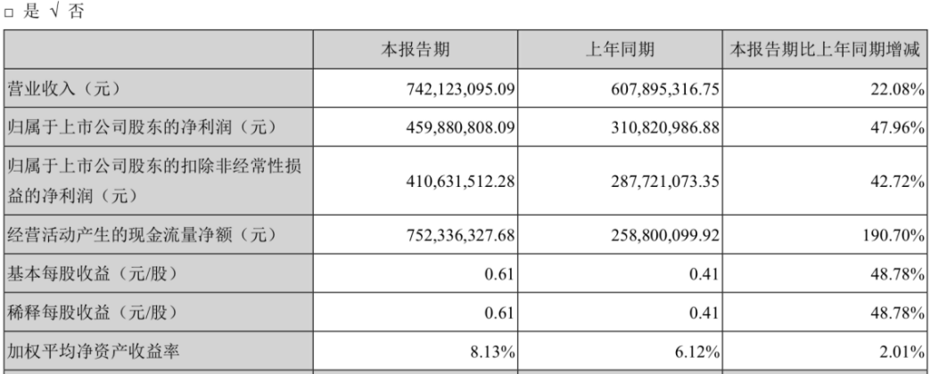 今年上半年,富森美营收和净利润均实现较大幅度增长。财报显示,营业收入约7.42亿元,同比增加22.08%;归属于上市公司股东的净利润约4.6亿元,同比增加47.96%;扣非净利润为4.1亿元,同比增加42.72%;营业利润5.52亿元,同比增长49.94%。
