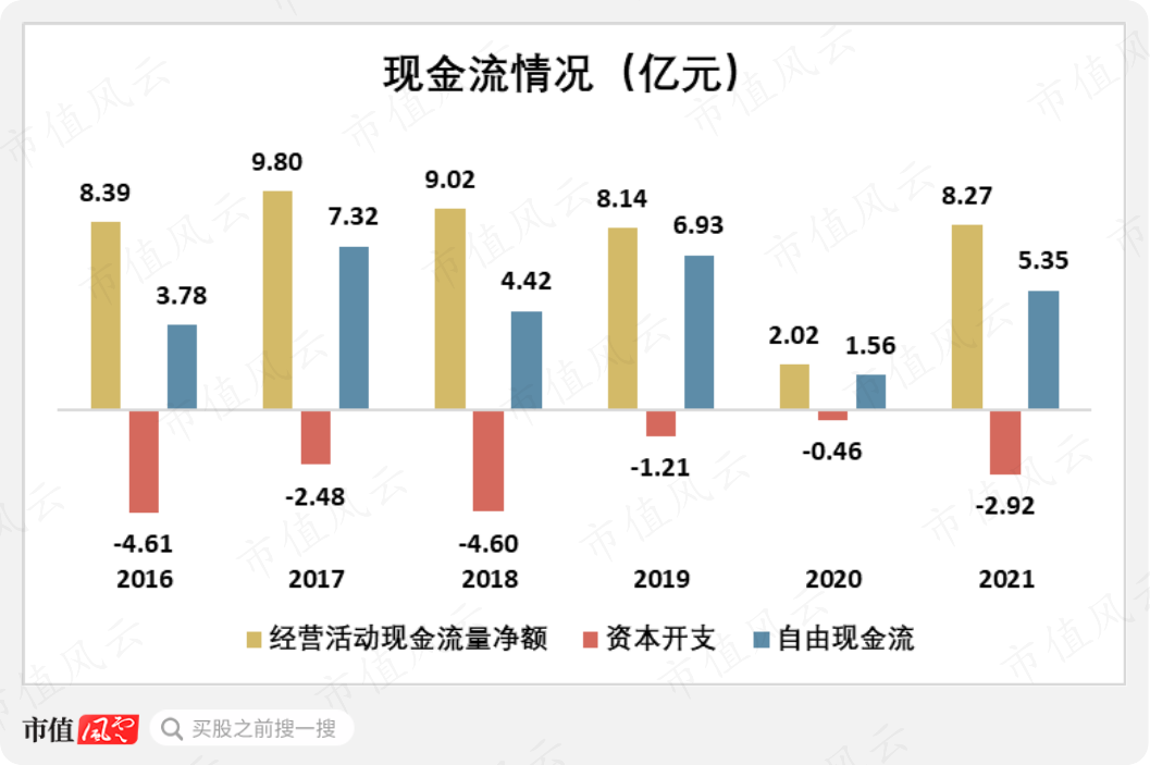 而经营性现金也基本保持每年8-9亿元的净流入,覆盖资本开支后,每年仍能沉淀数量可观的自由现金流,2021年自由现金流为5.4亿元(2020年发生的经营性现金流净额骤降,将下文进行阐述)。