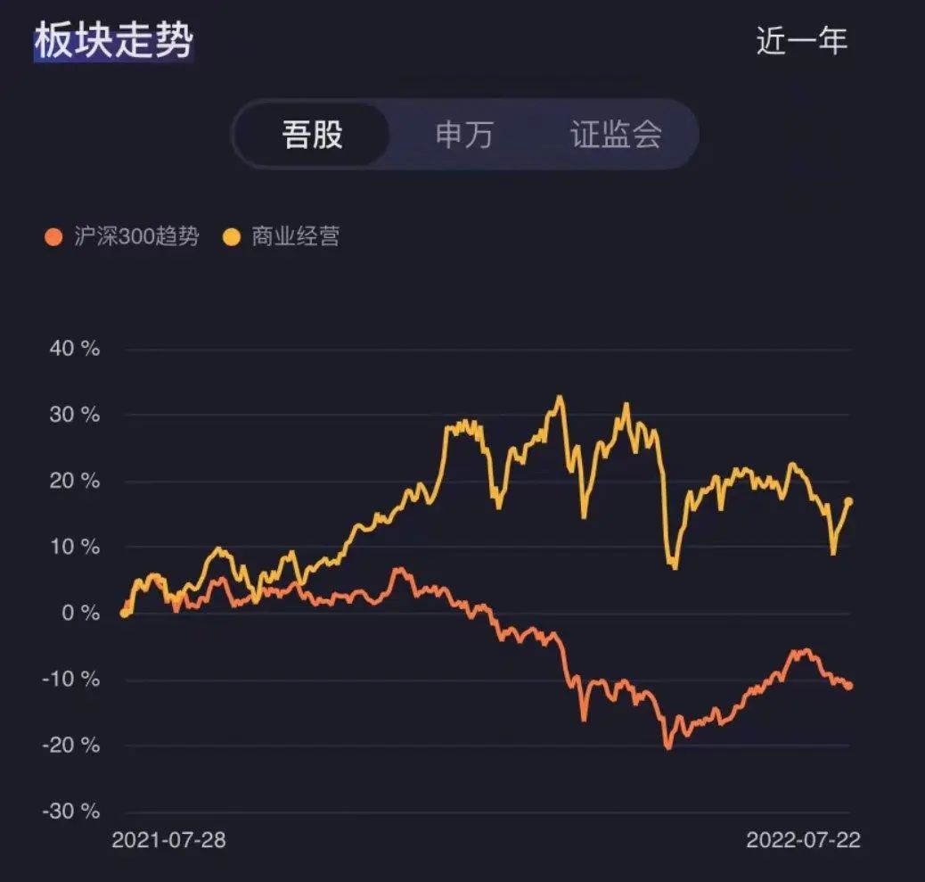 带着这些疑问我们点开投资必备的“市值风云”APP找数据来验证一下,呦嗬~“吾股”商业经营板块指数近一年居然相对于沪深300还走出了明显的正向收益曲线。