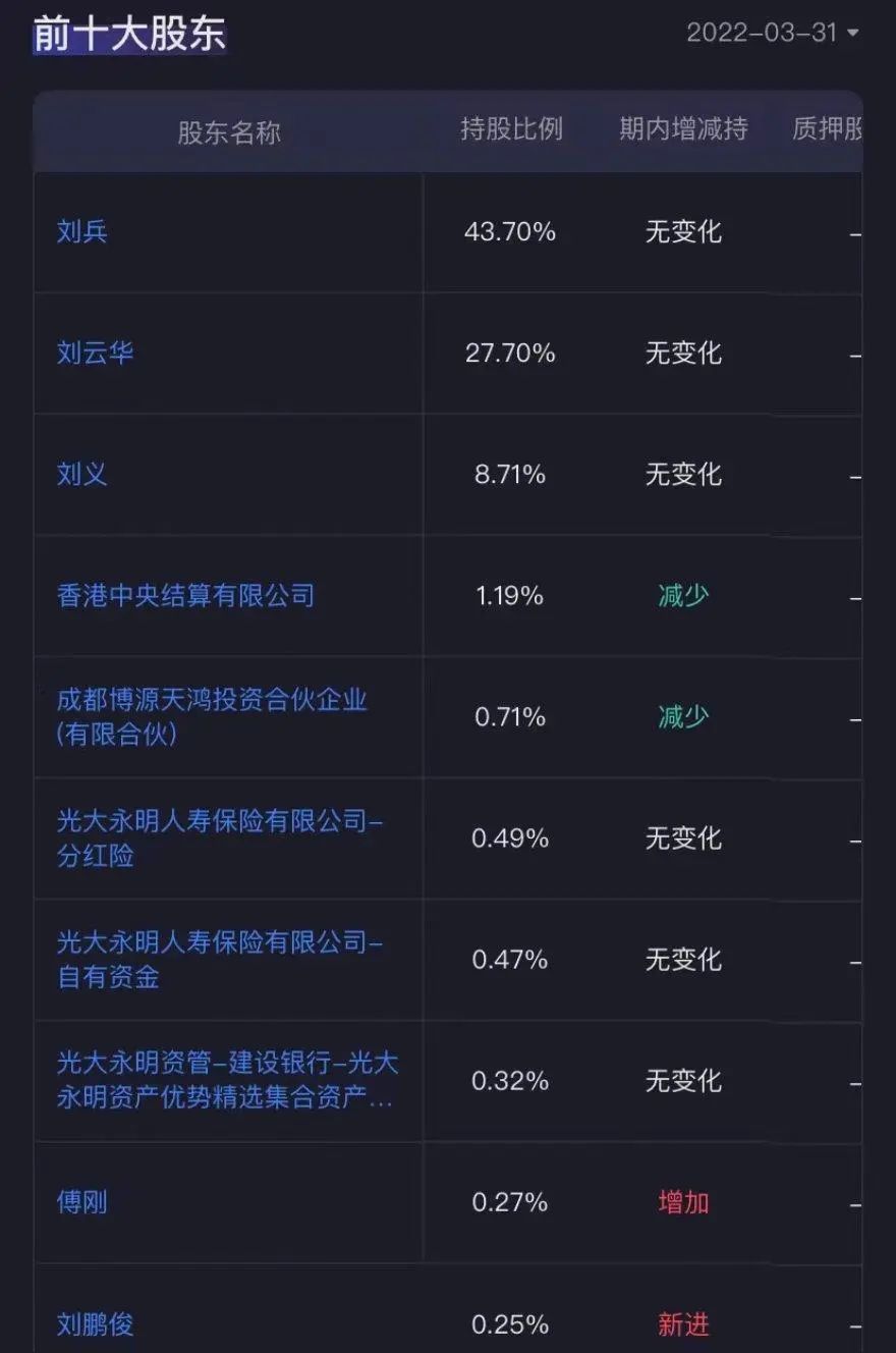 截至2022年3月末,实控人刘兵持有公司43.7%的股份,刘兵、刘华云、刘义三人作为一致行动人,共持有公司股份合计达80%,实控人控制权稳固。