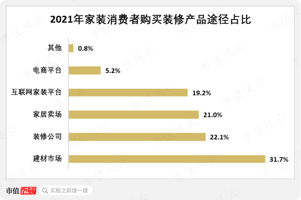 贝壳研究院统计,2021年电商平台与互联网家装平台在消费者购买装修产品的渠道占比合计约为24%,虽然线下家居建材卖场等仍然占据主导地位,但线上渠道的影响力已不容小觑。