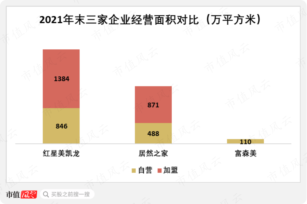 截至2021年末,美凯龙的经营面积(自营:加盟≈4:6)总计2230万平方米;