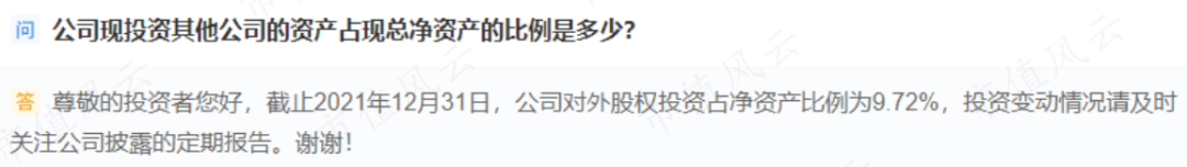 截至2021年末,公司对外股权投资占净资产的比例约为10%,规模尚小,目前金融资产投资的结果显示良好。