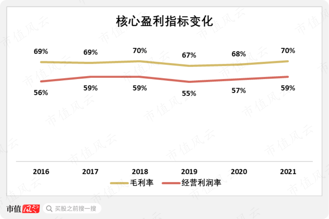 2016年以来,公司的毛利率稳定保持在67%以上,2021年为70%;而其经营利润率同样保持在55%以上,2021年达到59%。
