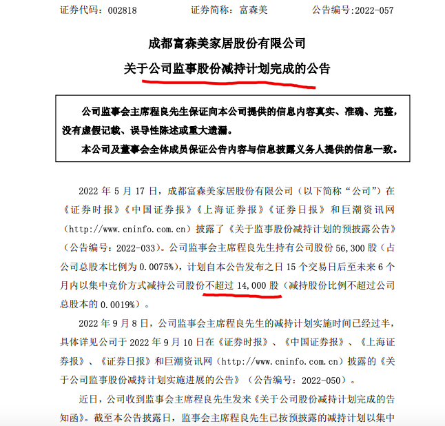 据了解,2022年5月17日,富森美发布公告称,公司监事会主席程良先生持有公司股份56,300股(占公司总股本比例为0.0075%),计划自本公告发布之日15个交易日后至未来6个月内以集中竞价方式减持公司股份不超过14,000股(减持股份比例不超过公司总股本的0.0019%)。