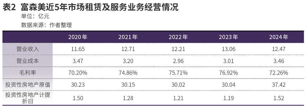 由此可见,大未必强,大未必美。既然如此,富森美也就没必要过于追求成长。事实上,这家公司当前正处于“成长的烦恼”中——随着天府项目的建成,2024年末富森美的投资性房地产原值猛增了7.38亿元。与此同时,投资性房地产计提的折旧也增加了0.33亿元,这与此前三年的势头迥异。公司租赁及服务业务的毛利率开始也掉头向下了。