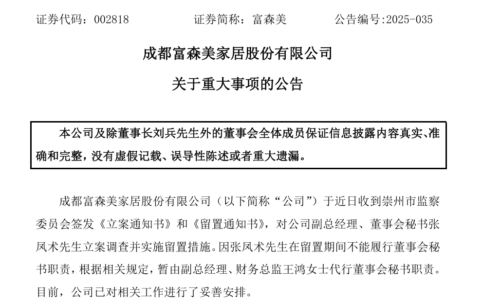 11月25日,成都 富森美 家居股份有限公司(代码:002818)发布公告称,副总经理、董事会秘书张凤术因被立案调查,目前已被实施留置措施。这是继今年7月 富森美 董事长、实际控制人刘兵被留置后,又一位核心高管被监察机关采取强制措施。