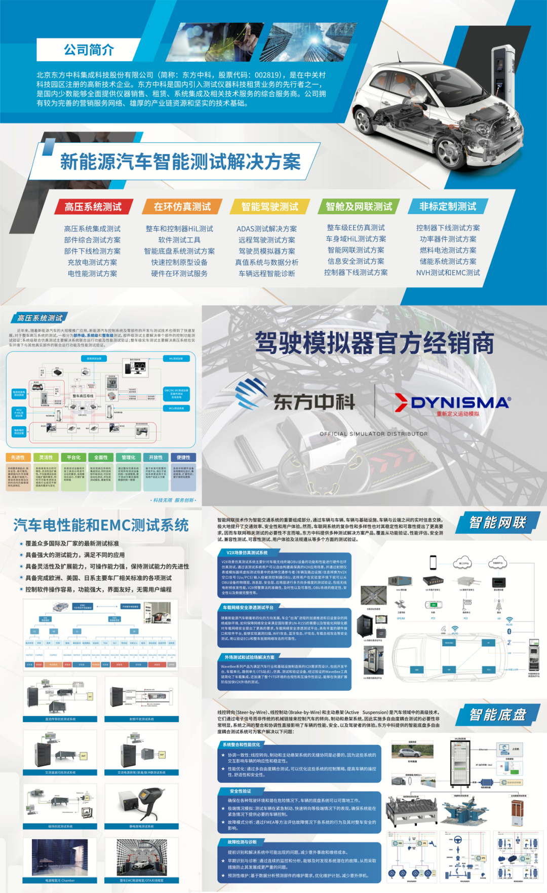 高压测试系统、在环仿真测试、智能驾驶测试、智舱及网联测试、EMC测试、非标定制测试、氢储充测试作为东方中科的传统优势解决方案再次在测试展亮相;高性能驾驶模拟器、C-V2X仿真测试系统作为全新产品在本次展会闪亮登场。东方中科作为国内专业的技术服务公司,所研发的产品及解决方案已经积累了多年行业经验,满足了众多客户在车辆开发、测试验证等众多需求。
