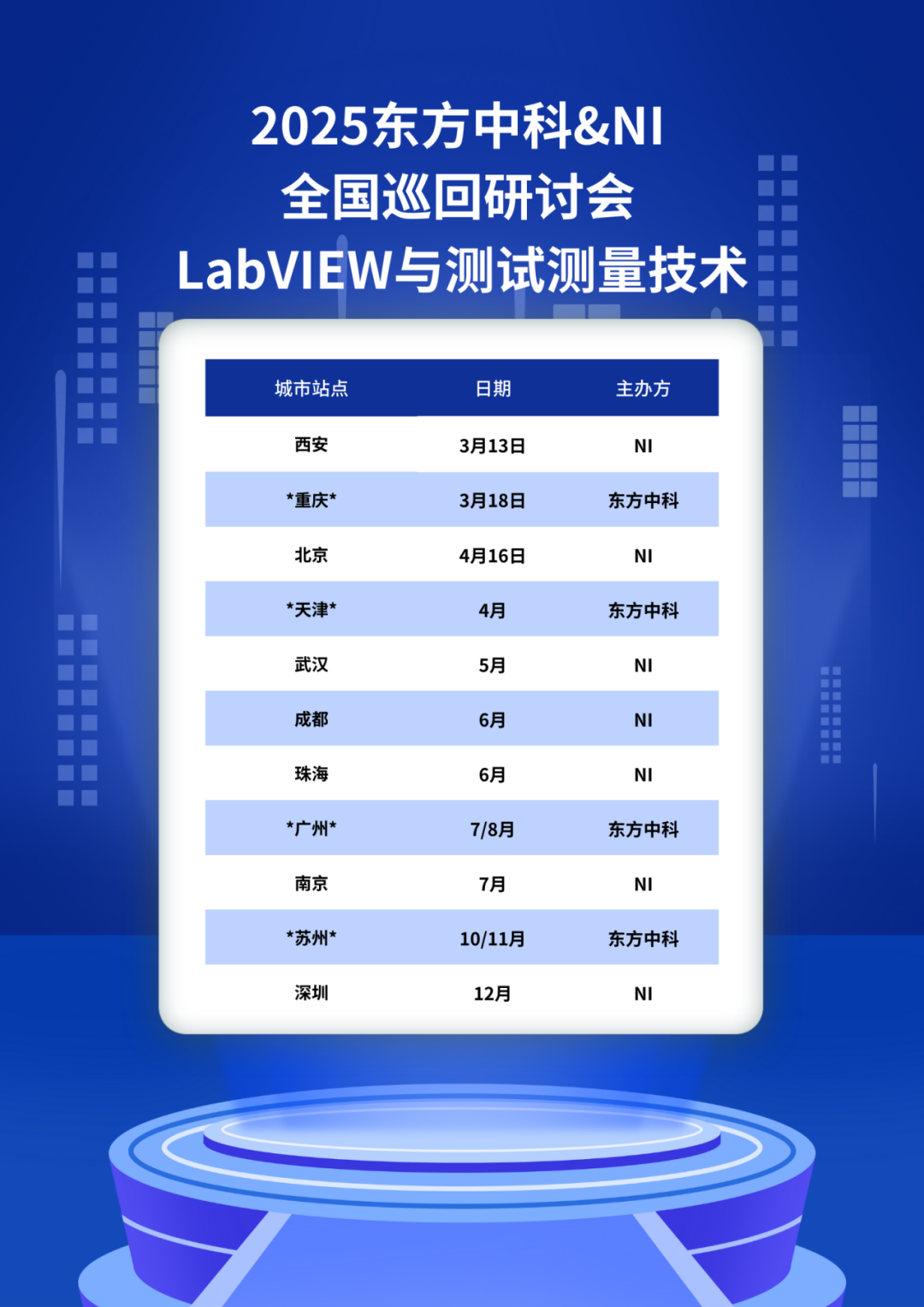 研讨会将聚焦LabVIEW前沿技术和全新框架,新产品介绍及应用方案展示。同时,还根据城市产业特点,选择工程师与技术专家热衷探讨的前沿话题,与东方中科和NI资深研发同事进行深入交流,共同探讨测试测量新技术发展和应用。