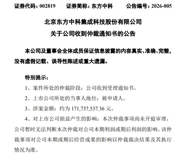 3月6日,东方中科(002819)发布公告,公司于近日收到中国国际经济贸易仲裁委员会出具的《DC20260219号业绩承诺及补偿协议争议案仲裁通知》,因与万里锦程创业投资有限公司(以下简称“万里锦程”)及刘达就业绩承诺补偿事项存在争议,公司被申请仲裁,涉案金额约为1.72亿元。