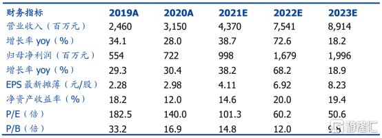 基于大合同签订,国盛证券今日发布研报,上调凯莱英盈利预测。预计公司2021-2023年归母净利润分别为9.98亿、16.79亿、19.96亿元,增长分别为38.2%、68.2%、18.9%。EPS分别为4.11元、6.92元、8.23元,对应PE分别为101x,60x,51x。未来几年公司有望随着商业化项目的增多业绩呈现高速增长,后劲十足。