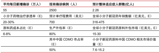 由于新冠药物为突发需求,且供应量需求大,预计其生产外包率较高——假设原料药成本占比6%,外包率80%,则对应CMO市场约15-25亿美元——若进一步假设其中50%的生产外包给到中国企业(供应链快速集成需求强,中国企业反馈快),则中国小分子CDMO企业能拿到的小分子新冠药物相关市场预计约为50-75亿元人民币(年度金额,凯莱英已经拿到30亿),300-400亿元人民币的中国小分子CMO/CDMO市场有望提速15%-20%,预计其中龙头企业有望受益更加明显。
