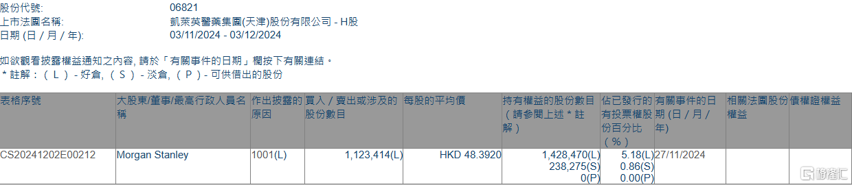 根据联交所最新权益披露资料显示,2024年11月27日,凯莱英(06821.HK)获Morgan Stanley以每股均价48.392港元增持好仓112.34万股,涉资约5436.43万港元。