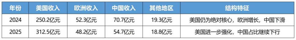 药明康德美国高增、欧洲稳健、中国承压。2025年,药明康德美国收入进一步升至312.5亿元,同比增长34.3%,欧洲收入48.2亿元,中国收入54.7亿元,其他地区18.8亿元。美国市场的主导地位进一步强化,中国收入占比继续下行。这背后有两个核心逻辑: