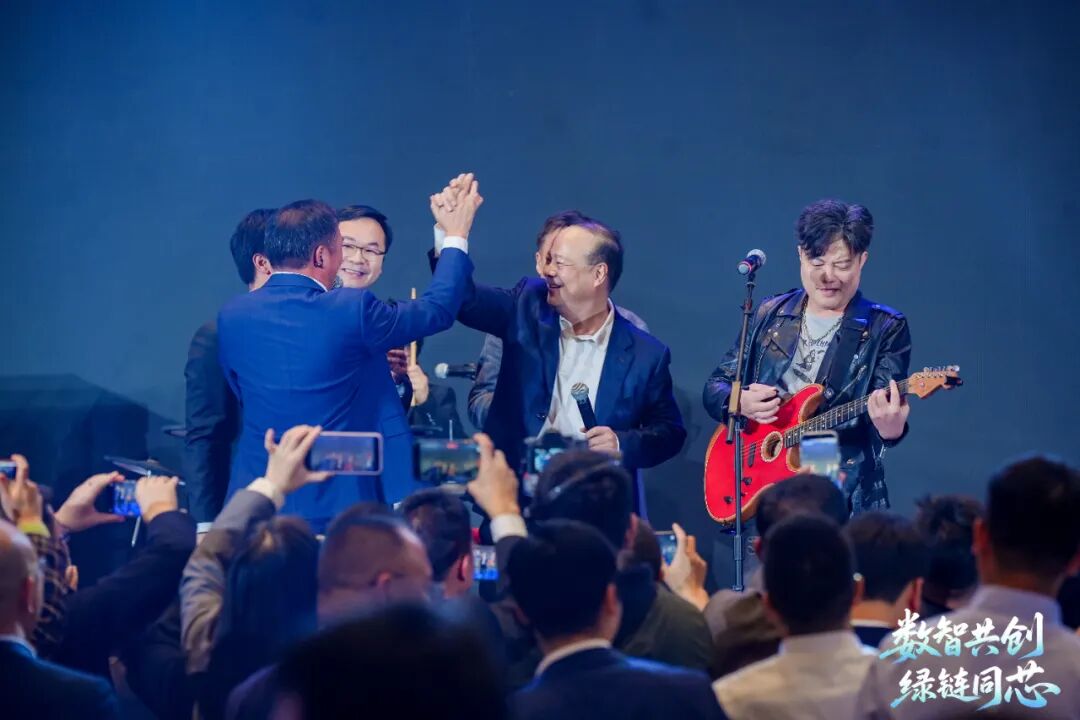 答谢晚宴上,宁德时代董事长曾毓群携高管团队与和胜新能源总经理宾炜等供应商伙伴代表合唱歌曲《光辉岁月》、《海阔天空》