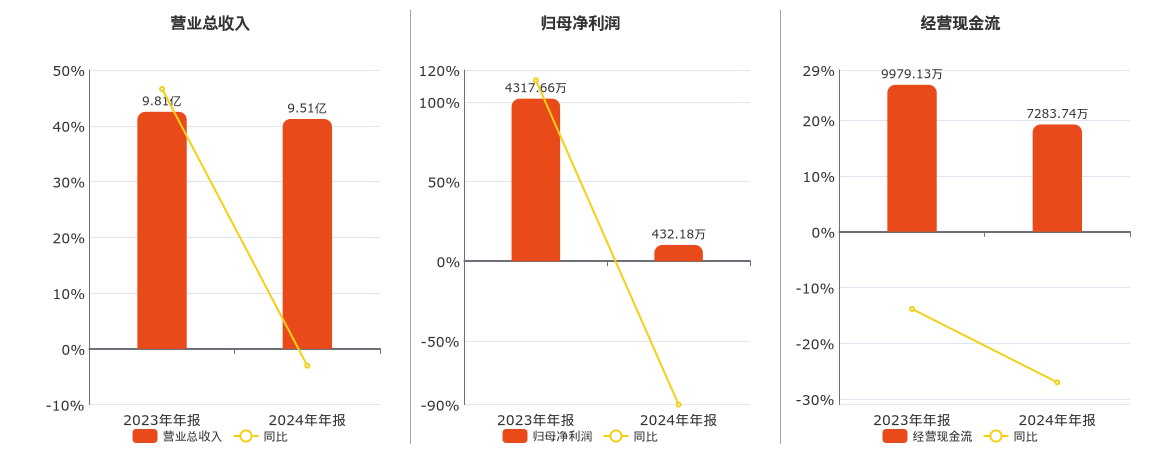 公司营业总收入为9.51亿元,在已披露的同业公司中排名第8,较去年同报告期营业总收入减少2961.29万元,同比较去年同期下降3.02%。归母净利润为432.18万元,在已披露的同业公司中排名第8,较去年同报告期归母净利润减少3887.75万元,同比较去年同期下降90.00%。经营活动现金净流入为7283.74万元,在已披露的同业公司中排名第8,较去年同报告期经营活动现金净流入减少2696.92万元,同比较去年同期下降27.02%。
