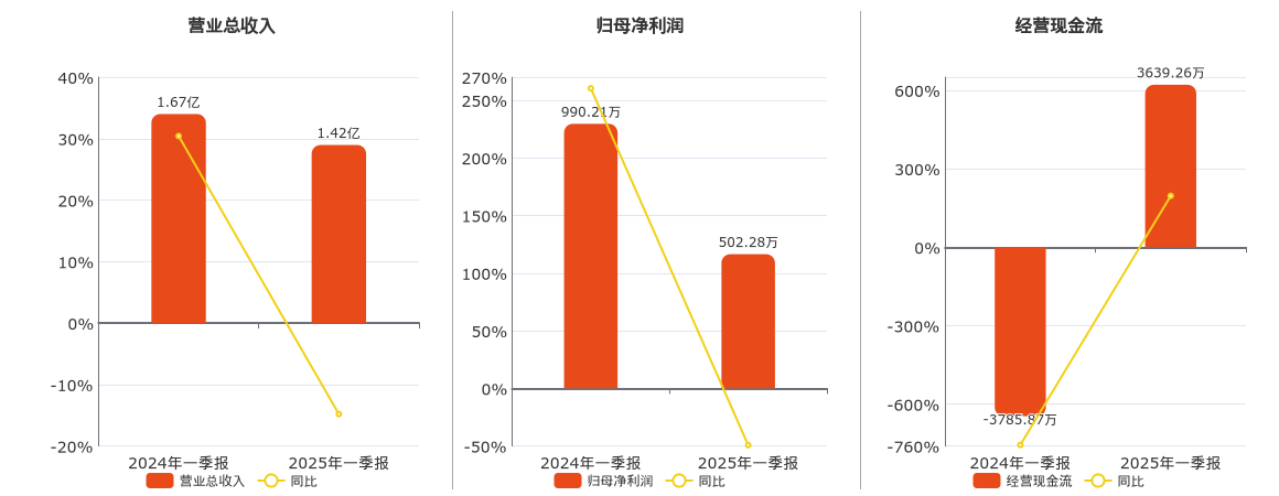 公司营业总收入为1.42亿元,较去年同报告期营业总收入减少2468.00万元,同比较去年同期下降14.81%。归母净利润为502.28万元,较去年同报告期归母净利润减少487.92万元,同比较去年同期下降49.27%。经营活动现金净流入为3639.26万元。