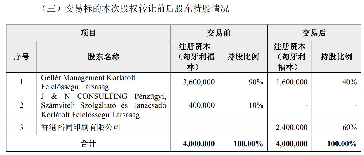 此外,交易完成后,Gelbert的股权结构将发生根本性变化:香港裕同将持有60%的股权,成为控股股东;而原大股东Gellér Management Kft(卖方1)的持股比例将降至40%,原小股东J&N CONSULTING则彻底退出。