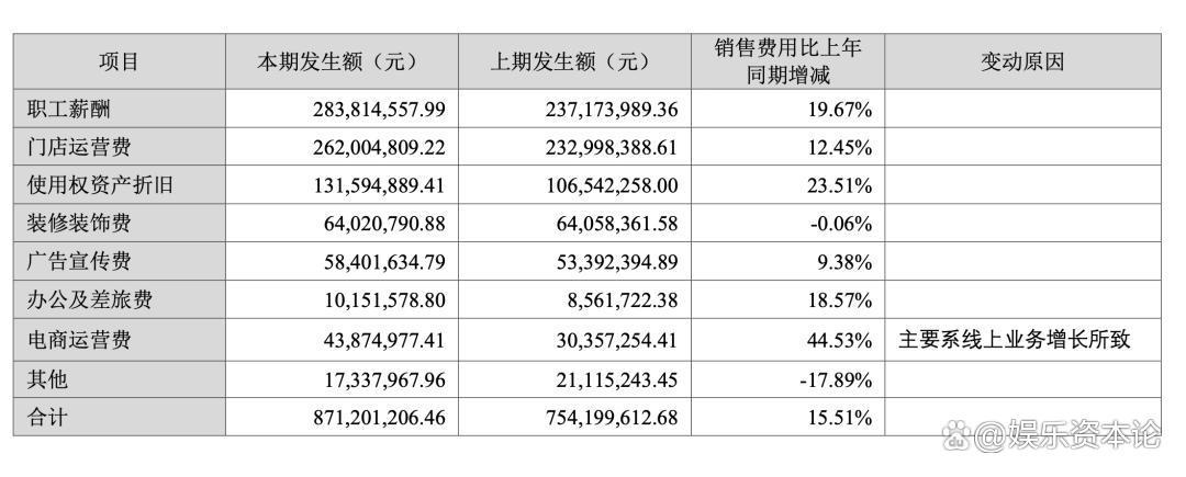 问题主要出在成本端。2025第三季度,销售费用从10.5亿增长到13.4亿。细节开销在半年报中集中呈现。半年报中, 比音勒芬 销售费用增长幅度同样超过一亿,其中职工薪酬增长超过4000万,门店运营费用提高近3000万;广告宣传费用增长近500万;电商运营费大涨超过1300万。而2024年, 比音勒芬 的广告宣传费、职工薪酬、门店运营费、装修装饰费,分别增加1亿元、6300万元、5300万元和3800万元。