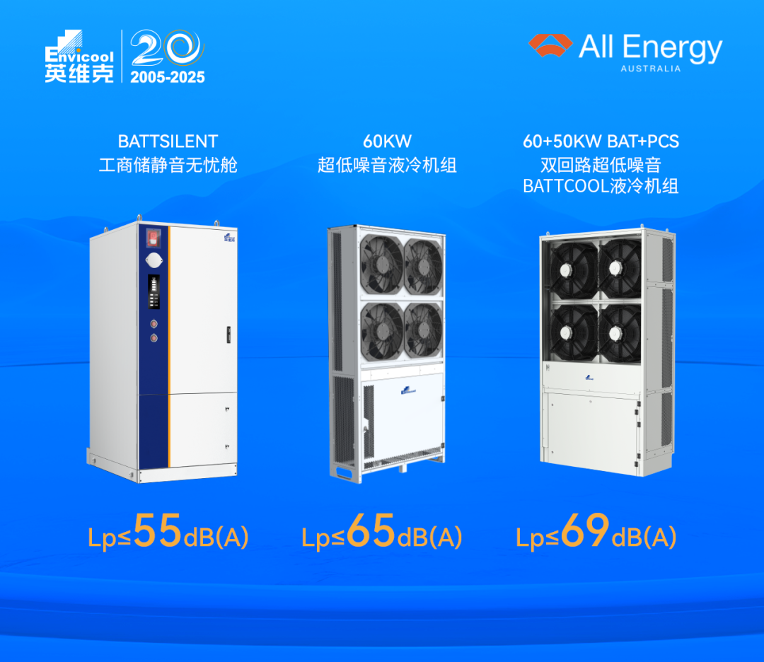 英维克BattSilent 工商储静音无忧舱、60kW超低噪音BattCool液冷机组、60+50kW BAT+PCS 双回路超低噪音BattCool液冷机组三大核心产品以超静音优势备受关注。