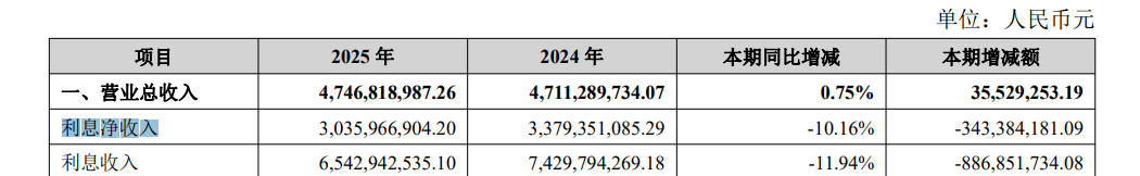 年报数据显示,2025年该行实现营业总收入47.47亿元,同比仅增0.75%,增速创下近年新低,营收增长进一步放缓;实现归母净利润19.79亿元,同比增长5.35%。作为银行业营收的核心支柱,利息净收入持续下滑成为拖累业绩的关键因素,2025年该行利息净收入仅30.36亿元,同比减少3.43亿元,降幅达10.16%,较2022年峰值水平大幅缩水,连续三年呈现负增长态势。
