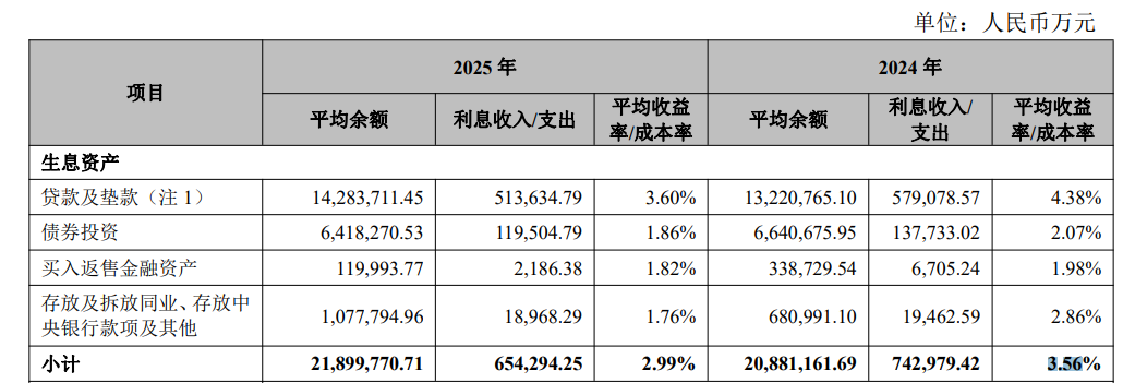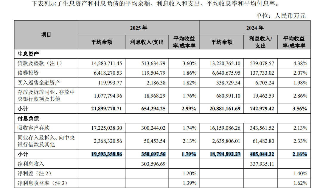 利息收入下滑的背后,是净息差的持续大幅收窄。受市场利率下行、银行业同业竞争加剧及LPR持续下调影响,该行资产端收益率显著走低,2025年生息资产收益率从2024年的3.56%降至2.99%,贷款收益率从4.38%降至3.60%,分别下行57个基点、78个基点。尽管该行持续优化负债结构,付息负债成本率同比下降37个基点至1.79%,但资产端收益率下行幅度远高于负债端成本改善幅度,全年净息差同比收窄23个基点至1.39%,盈利能力被持续挤压。