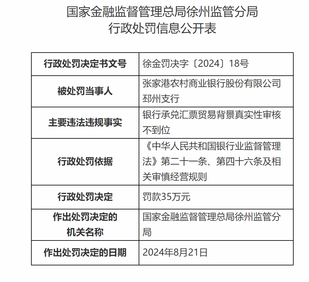 2024年8月,邳州支行因承兑汇票贸易背景真实性审核不到位,被徐州监管分局罚款35万元;2021年,该行还因个人消费贷款流入房地产、同业业务违规等问题,被合计罚款90万元。
