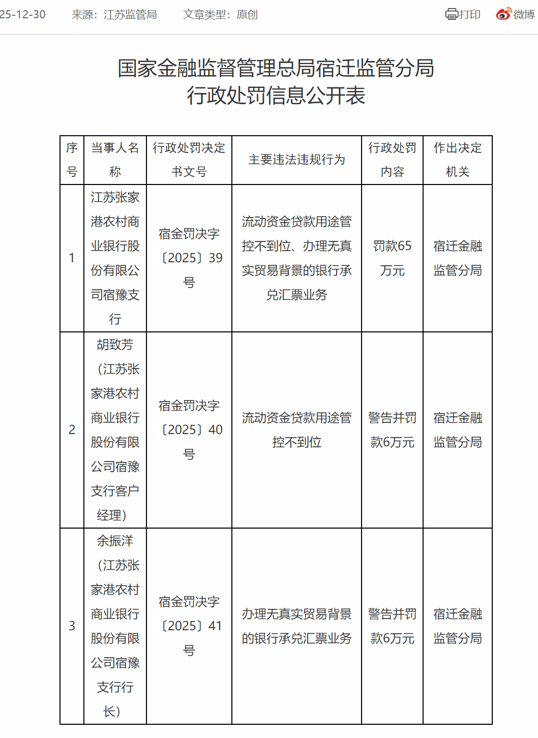 合规管理方面,2021年至2025年,该行及旗下分支机构多次收到监管罚单,违规问题屡查屡犯,主要集中于信贷管理、投资业务、风险隔离等环节。2025年12月30日,江苏金融监管局官网发布行政处罚信息公示表显示,因流动资金贷款用途管控不到位、办理无真实贸易背景的银行承兑汇票业务的主要违法违规行为,江苏张家港农村商业银行股份有限公司宿豫支行被宿迁金融监管分局罚款65万元,另有两位相关责任人分别被警告并罚款6万元。