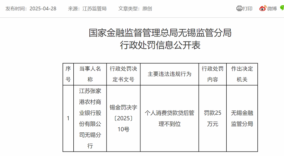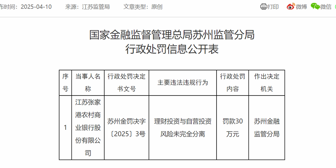 2025年4月,一月两罚,张家港行因理财投资与自营投资风险未完全分离,被国家金融监督管理总局苏州监管分局罚款30万元;张家港行无锡分行因个人消费贷款贷后管理不到位,被金融监督管理总局无锡监管分局罚款25万元。