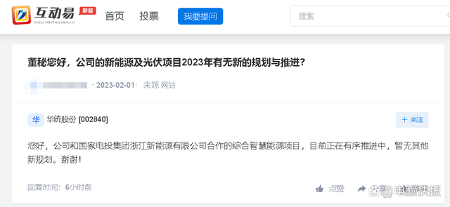 2023年2月1日,有投资者在互动易中向华统股份提问“公司的新能源及光伏项目2023年有无新的规划与推进?” 华统股份回复称“公司和国家电投集团浙江新能源有限公司合作的综合智慧能源项目,目前正在有序推进中,暂无其他新规划。”