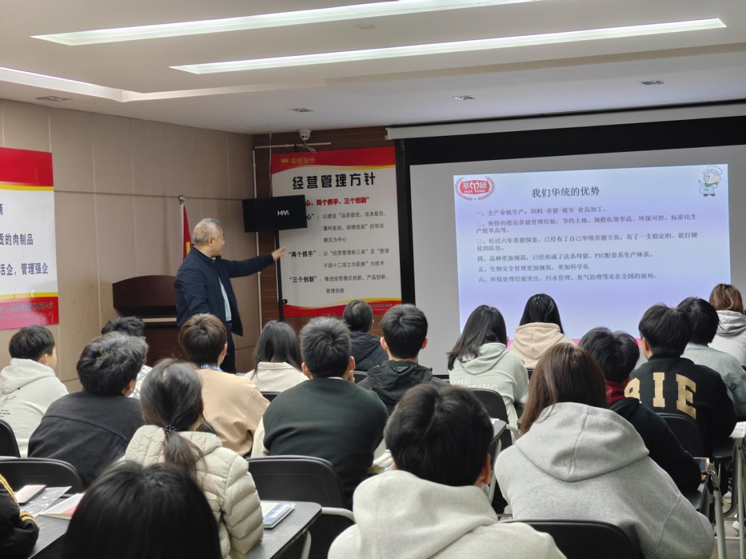 畜禽养殖事业部胡友战围绕企业核心优势展开分享:以全产业链(饲料-养猪-屠宰-食品加工)、楼房养猪为特色,聚焦规模化、智能化、低成本发展;打造稳定攻坚团队,规范生产体系,科学管理生物安全。他期待同学们扎根一线、深耕学习,在行业升级浪潮中成长为技术与管理骨干,共赴“行业第一梯队”目标。