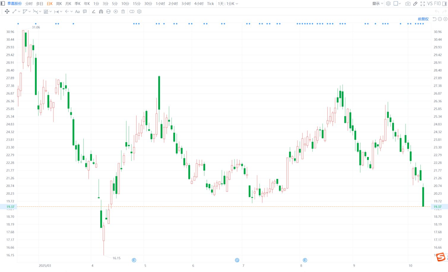 泰嘉股份(002843.SZ)今日低开低走,最终收跌8.2%报19.37元,股价创今年4月15日以来逾半年新低;全天成交2.9亿元,最新市值48.8亿元。泰嘉股份公告称,股东中联重科计划自预披露公告发布之日起15个交易日后的3个月内,通过集中竞价和大宗交易方式减持公司股份不超过7,552,126股,占公司总股本的3%。