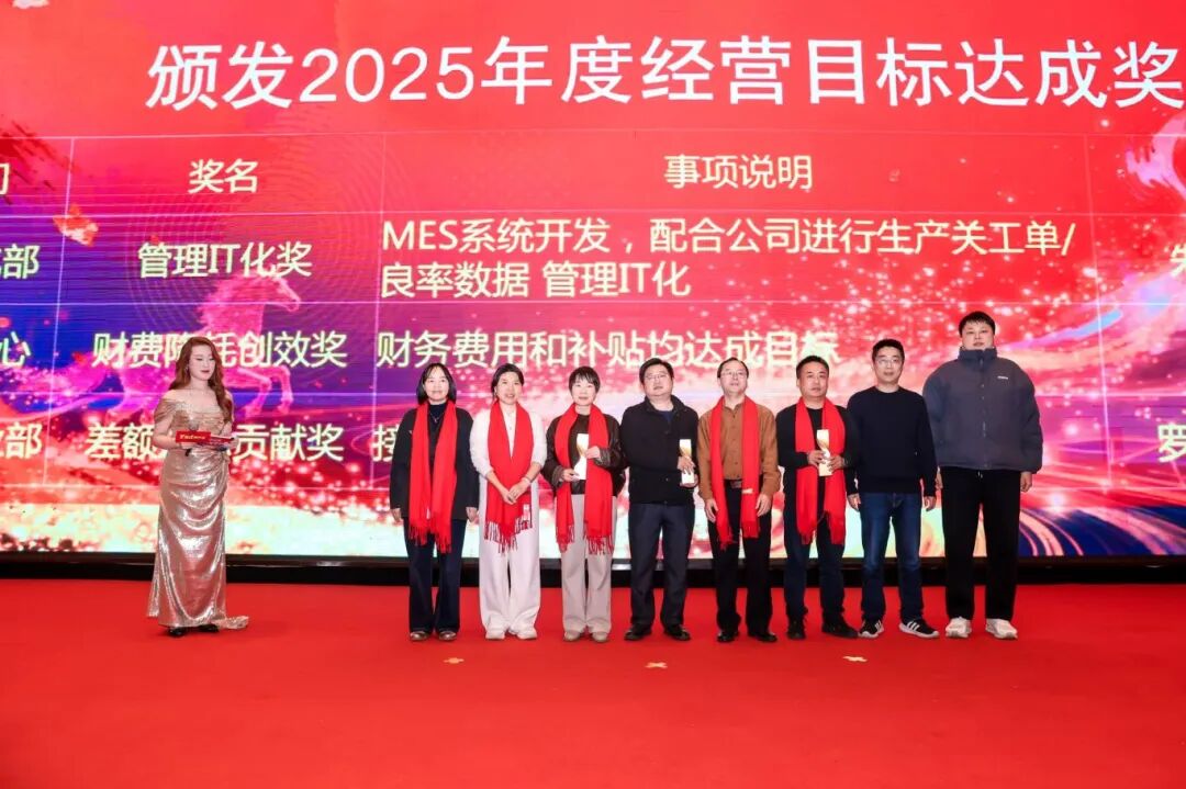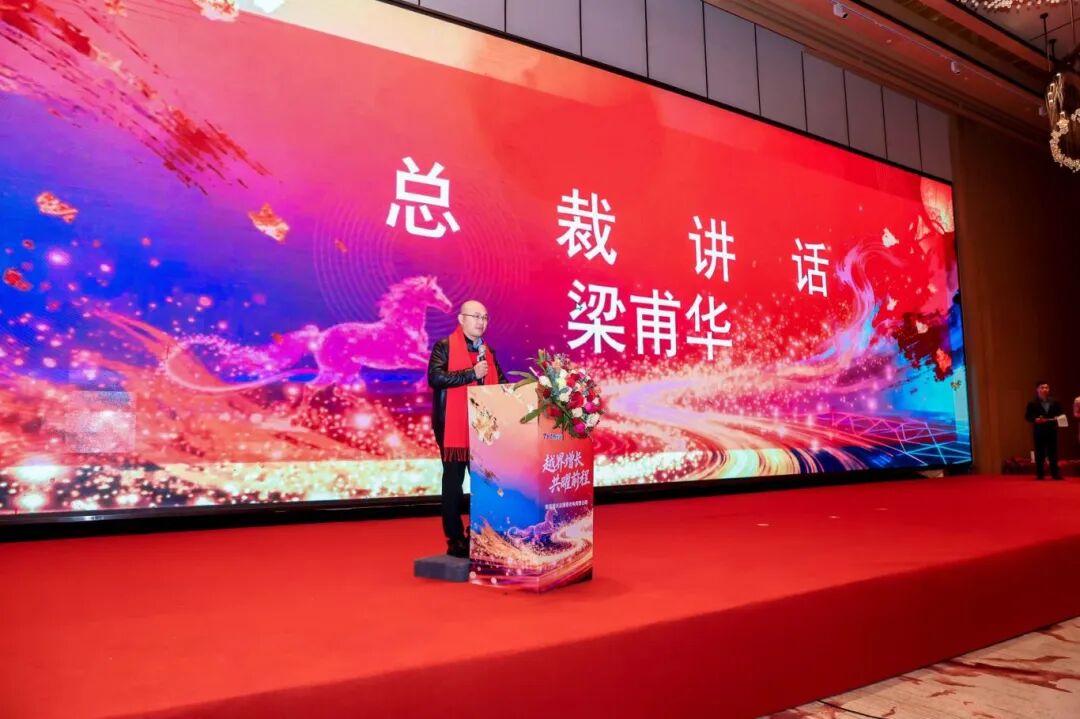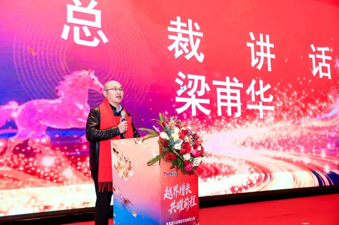 18时整,晚宴在温馨的暖场视频中正式拉开帷幕。主持人热情开场,向所有在场同仁及嘉宾致以诚挚欢迎。同兴达光学摄像事业群总裁梁甫华先生,率先登台致欢迎辞,他以详实的数据全面回顾了公司在2025年取得的营收增长与利润提升,充分肯定了全体员工的辛勤付出,并清晰地阐述了公司2026年的战略方向与发展目标,激励人心的话语引来阵阵掌声。