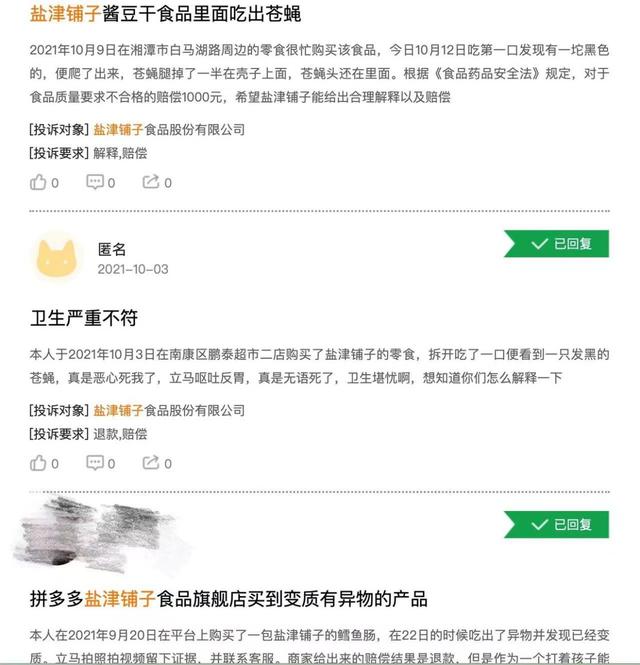 但事实并非如此,公开资料显示,在爆出黑糖话梅重金属超标之前,盐津铺子就多次出现食品安全问题。2017年3月,盐津铺子生产的甘甜话梅被检出安赛蜜;2018年12月,盐津铺子因生产的山椒凤爪菌落超标被通告;2020年11月,盐津铺子薯片检出潜在致癌物。除抽检不合格外,消费者投诉盐津铺子产品“吃出苍蝇”“变质”“有异物”的也不在少数。