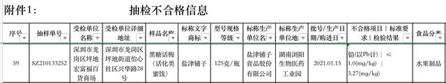 11月10日,深圳市市场监督管理局发布2021年食品安全抽样检验情况通报(第三十一期),称深圳市龙岗区坪地宏富福百货商场销售的盐津铺子食品股份有限公司生产的1批次黑糖话梅(生产日期:2021.01.15)被检出铅(以Pb计)超标。
