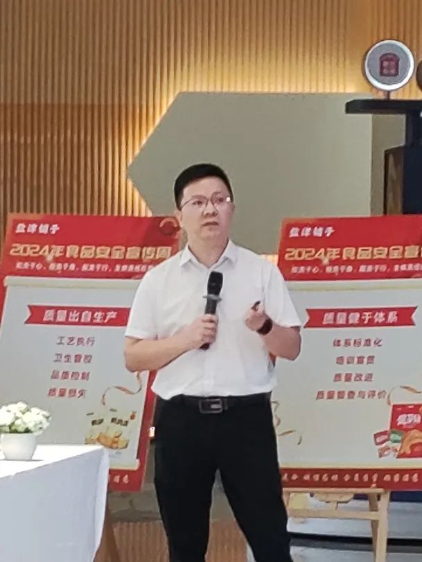 品控中心谭益升总监对全国食品安全宣传周活动背景进行介绍。会议宣导了2024年由张学武董事长亲自确定为盐津铺子质量管理年,提出《5·30质量与食品安全工作重要指示12条》,坚定清晰地指引盐津质量工作变革性发展,全面落实企业主体责任。