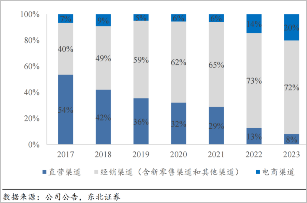 2017年至2023年,盐津铺子直营渠道收入占比从53.6%降至8.1%,经销渠道收入占比从40%提升至72%,电商渠道收入占比从7%提升至20%。