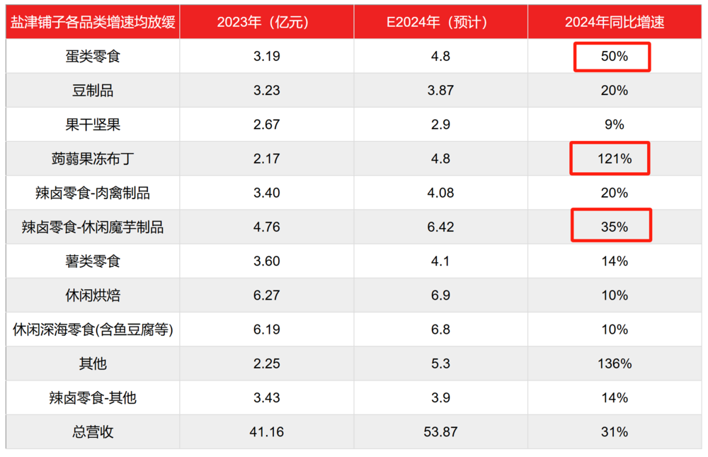 不过,“大魔王”素毛肚于2022年爆发,2023年表现不及预期,今年在低基数下销量略有回升,已近3年产品红利期末尾。“蛋皇”鹌鹑蛋2023年爆发,预计今年还将有1年放量红利期。但2024年之后,随着这些新品类的快速放量期接近尾声,盐津铺子未来的增长动力将面临考验。