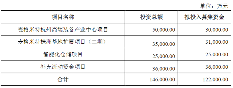 麦格米特本次拟发行可转债募集资金总额不超过人民币12.2亿元。本次发行可转债募集的资金总额扣除发行费用后拟投资于以下项目:3亿元用于杭州高端装备产业中心项目,3.1亿元用于株洲基地扩展项目(二期),2.5亿元用于智能化仓储项目,3.6亿元用于补充流动资金。