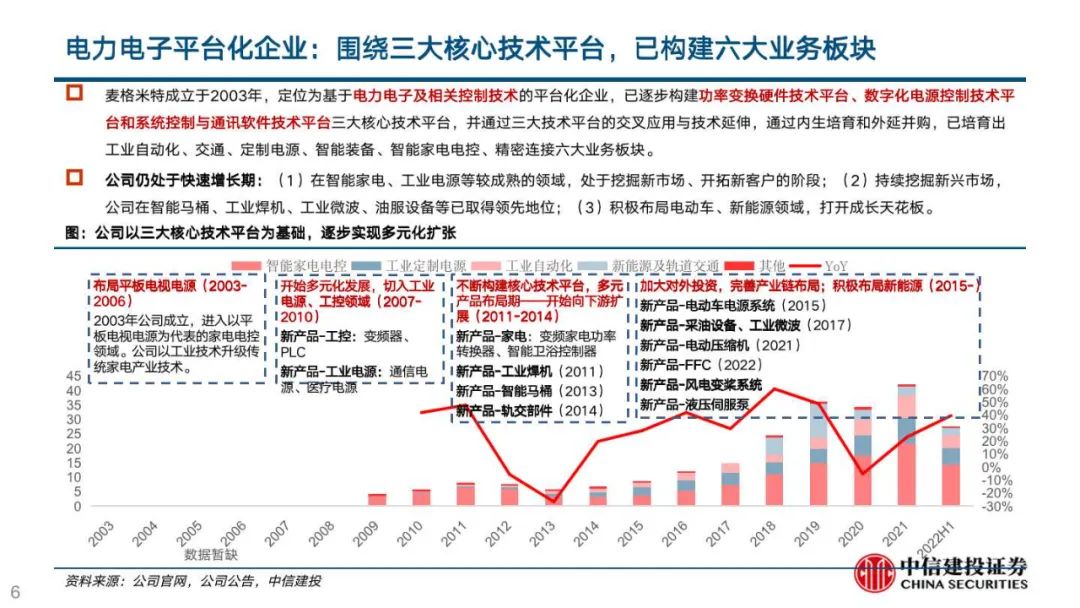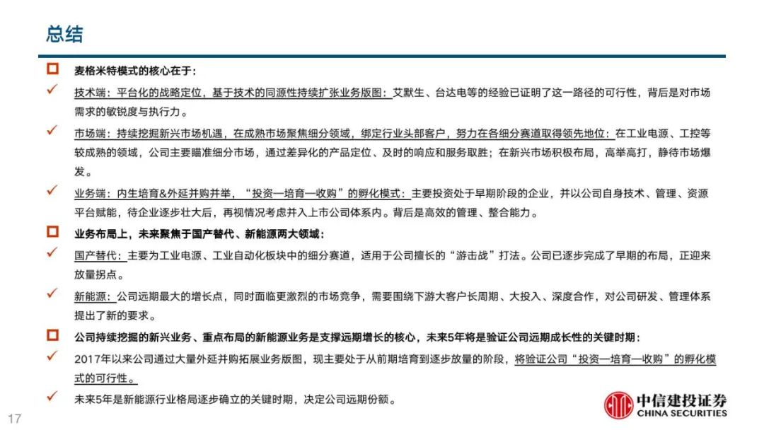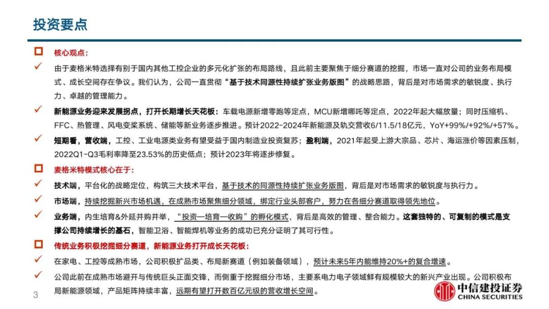 由于麦格米特选择有别于国内其他工控企业的多元化扩张的布局路线,且此前主要聚焦于细分赛道的挖掘,市场一直对公司的业务布局模式、成长空间存在争议。我们认为,公司一直贯彻“基于技术同源性持续扩张业务版图”的战略思路,背后是对市场需求的敏锐度、执行力、卓越的管理能力。