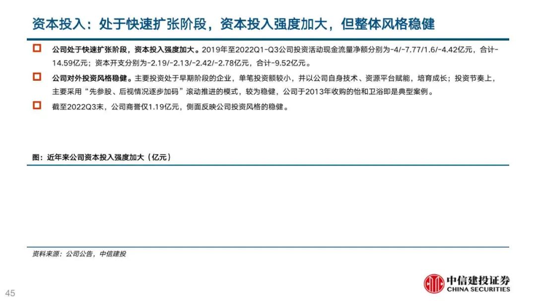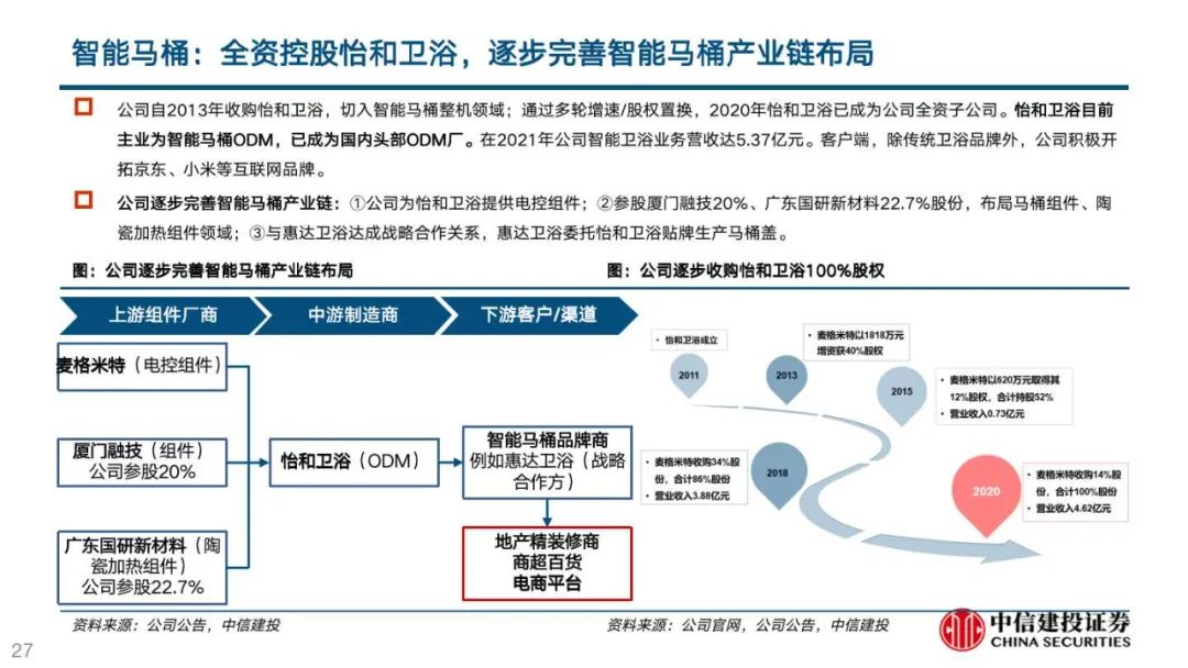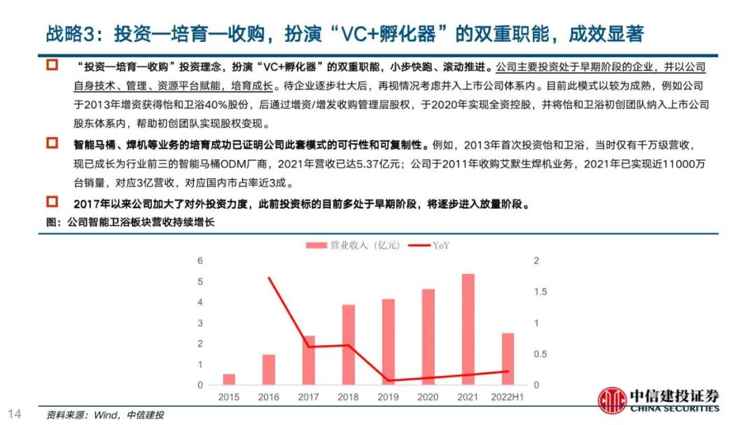 业务端,内生培育外延并购并举,“投资—培育—收购”的孵化模式,背后是高效的管理、整合能力。这套独特的、可复制的模式是支撑公司持续增长的基石,智能卫浴、智能焊机等业务的成功已充分证明了其可行性。