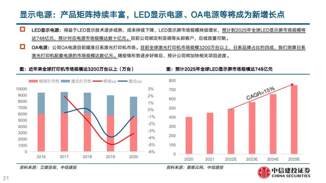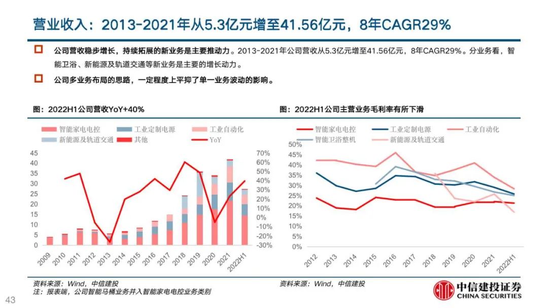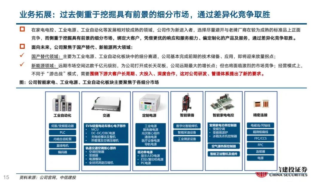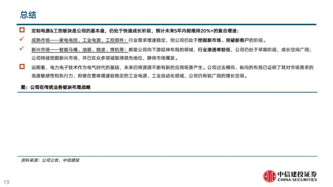 在家电、工控等成熟市场,公司积极扩品类、布局新赛道(例如装备领域),预计未来5年内能维持20%+的复合增速。
