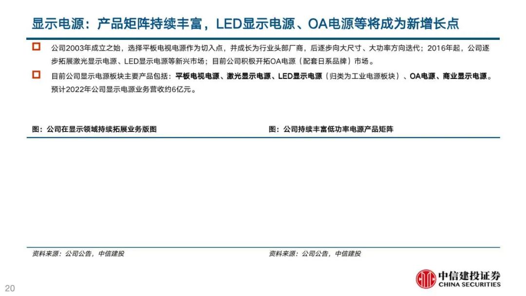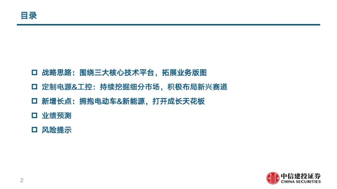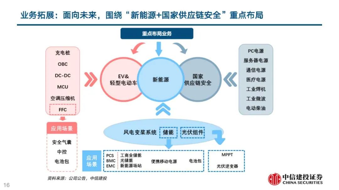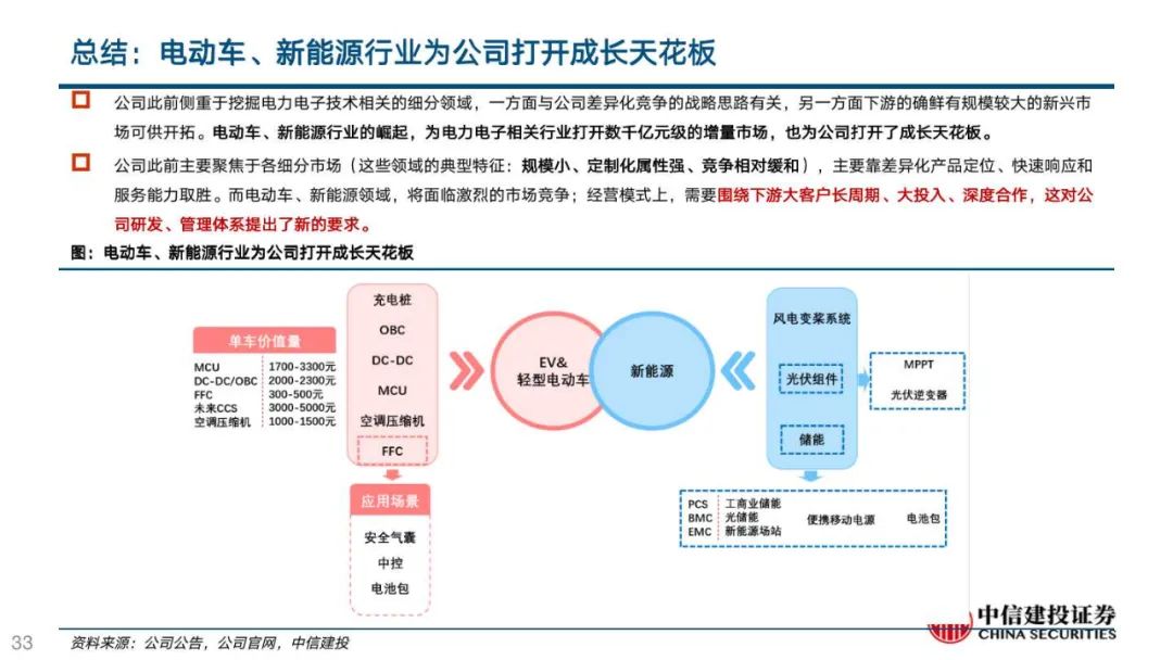 公司此前在成熟市场避开与传统巨头正面交锋,而侧重于挖掘细分市场,主要系电力电子领域鲜有规模较大的新兴产业出现。公司积极布局新能源领域,产品矩阵持续丰富,远期有望打开数百亿元级的营收增长空间。