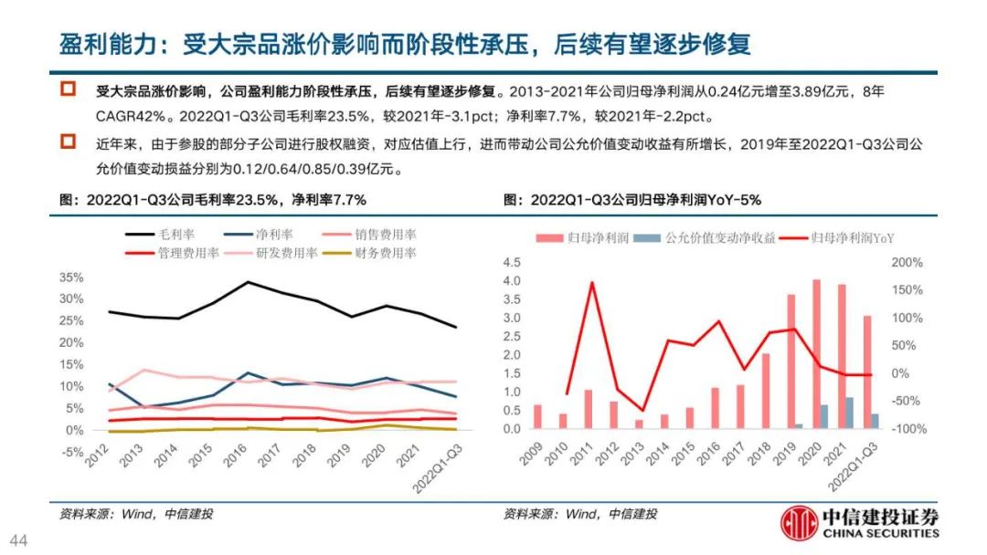 受益于上游原材料降价,2023年起盈利能力有望逐步修复:营收端,工控、工业电源类业务有望受益于国内制造业逐步复苏;盈利端,2021年起受上游大宗品、芯片、海运涨价等因素压制,2022Q1-Q3毛利率降至23.53%的历史低点;预计2023年将逐步修复。