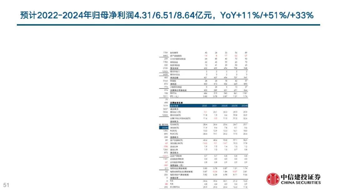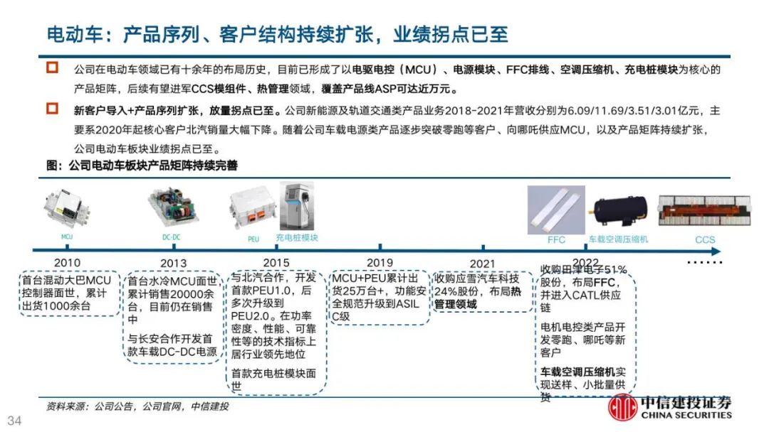 新能源业务迎来发展拐点,产品矩阵持续丰富:车载电源新增零跑等定点,MCU新增哪吒等定点,2022年起大幅放量;同时压缩机、FFC、热管理、风电变桨系统、储能等新业务逐步推进。预计2022-2024年新能源及轨交营收有望达6/11.5/18亿元,YoY+99%/+92%/+57%。
