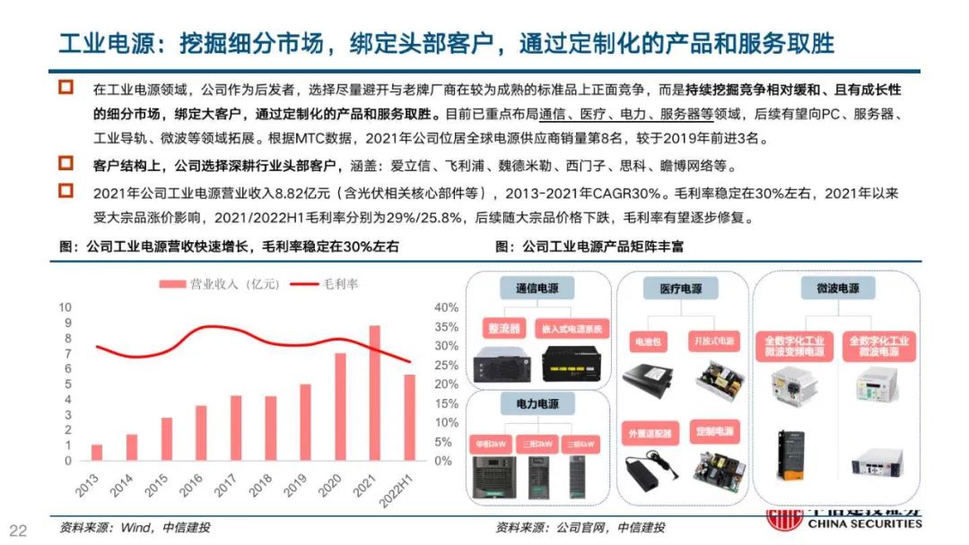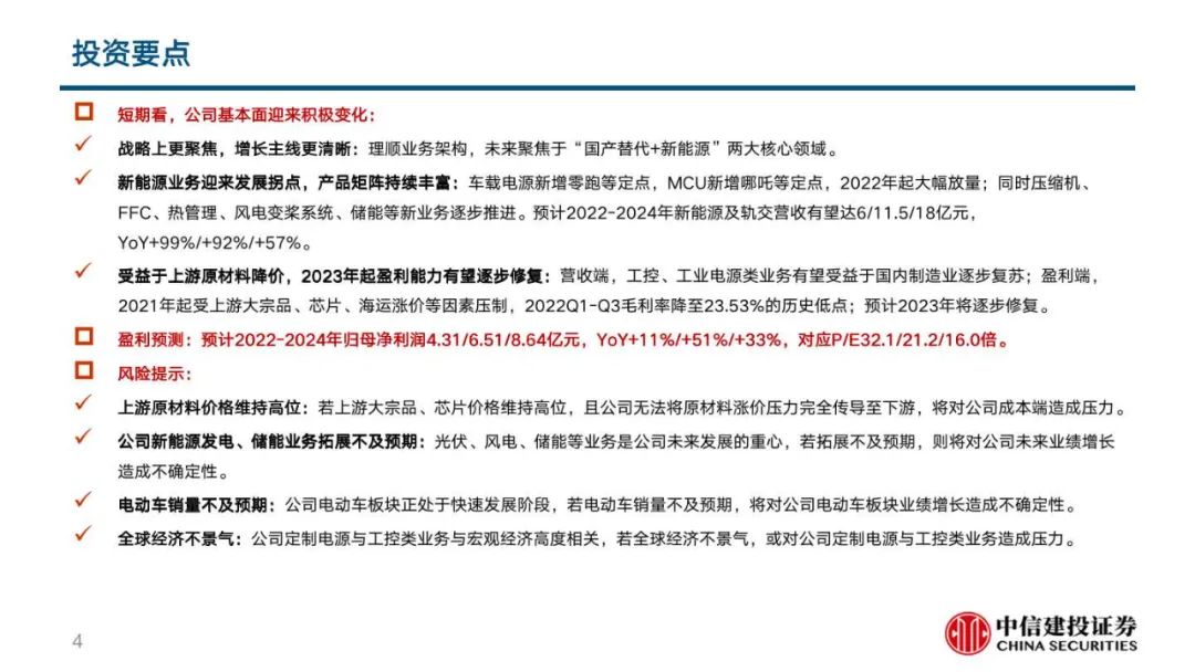 短期看,营收端,工控、工业电源类业务有望受益于国内制造业投资复苏;盈利端,2021年起受上游大宗品、芯片、海运涨价等因素压制,2022Q1-Q3毛利率降至23.53%的历史低点;预计2023年将逐步修复。