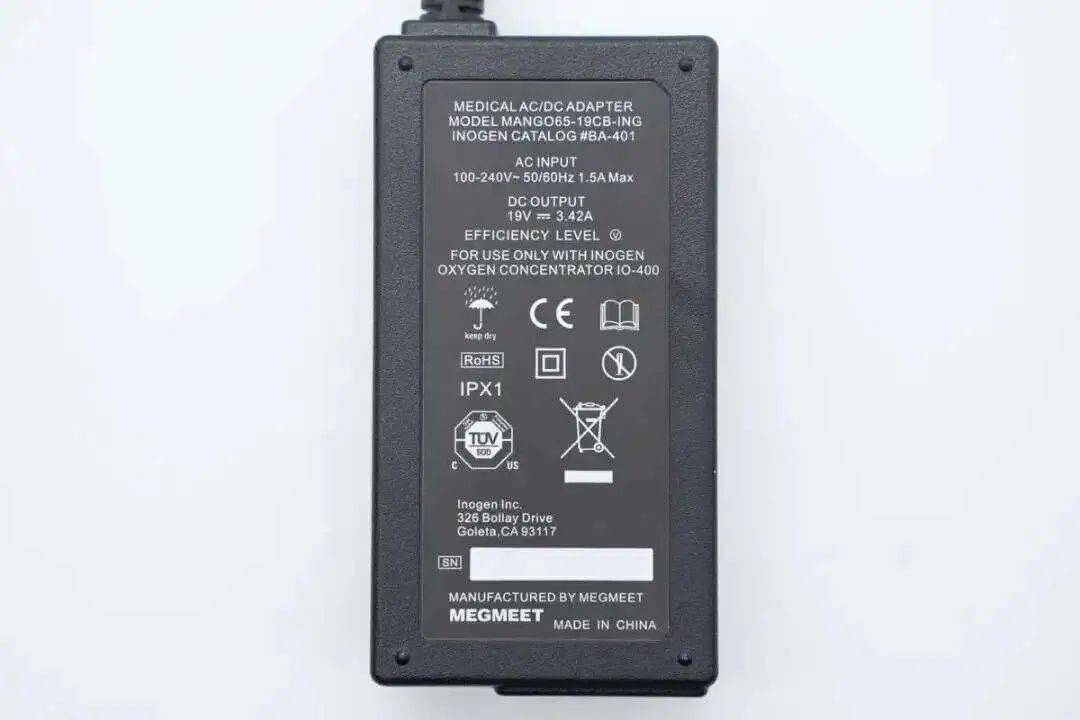 底部贴有适配器铭牌,支持 100-240V~50/60Hz 1.5A 输入,以及19V3.42A输出,通过了CE、TUV认证。麦格米特这款Mango系列65W适配器为医用级产品,适配器采用黑色塑料外壳,并配有绿色电源指示灯,便于了解供电状态。适配器输出规格为19V3.42A,输出功率为65W。适配器自带2米长输出线缆,满足不同使用场合应用。