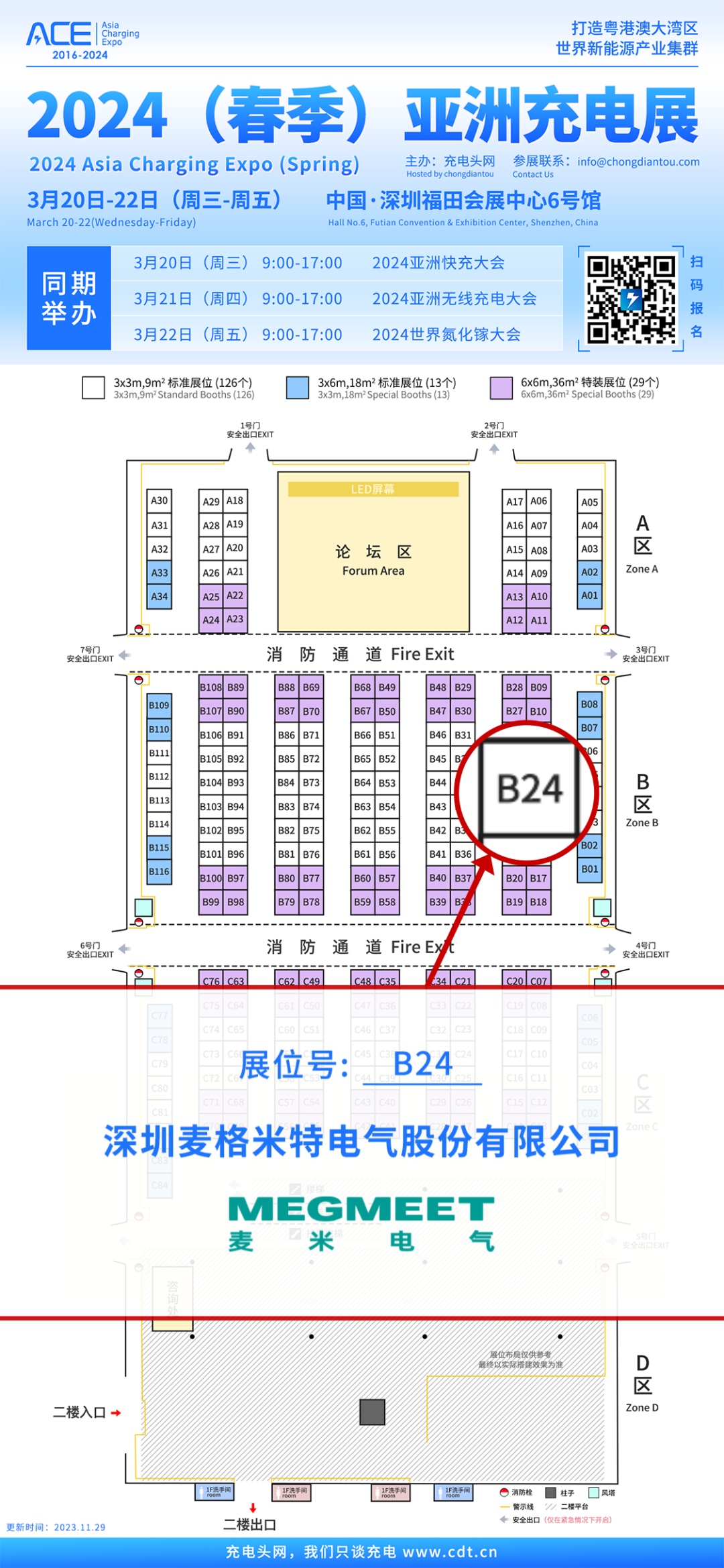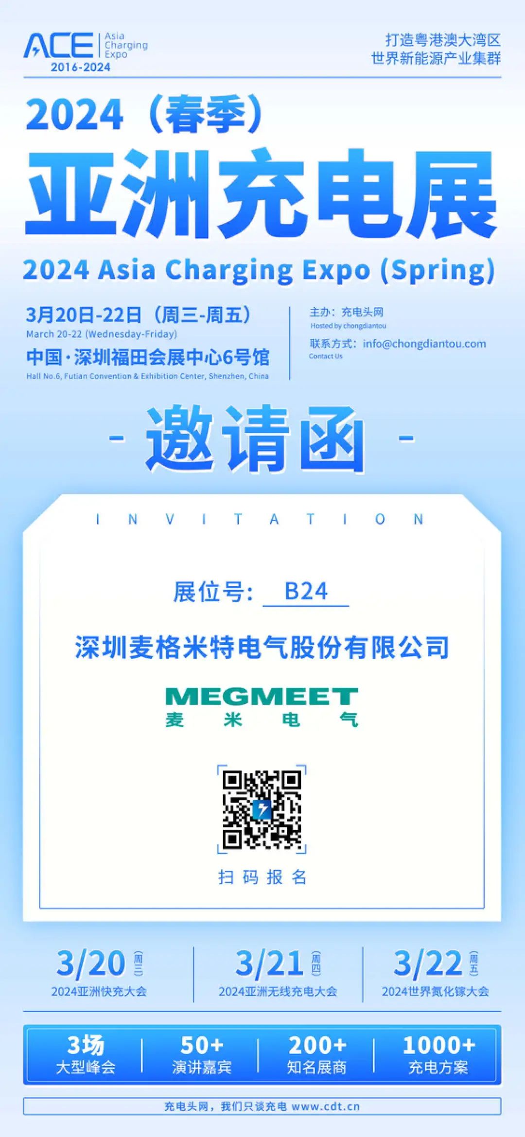 深圳麦格米特电气股份有限公司参加充电头网主办的2024(春季)亚洲充电展,展位号位于B区B24,3月20-22日欢迎莅临展会现场交流、洽谈。