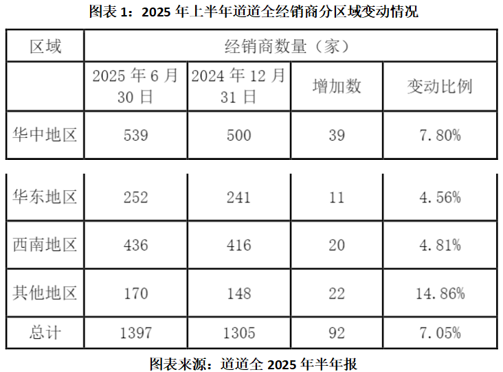 从渠道布局来看,半年报显示,截至今年上半年末,道道全在西南地区的经销商数量达到436家,跟去年年底相比增加了20家,变动比例为4.81%。从数量、增加数和变动比例来看,西南地区的终端网点覆盖仅次于华中地区,可能表明道道全正大力布局西南市场。